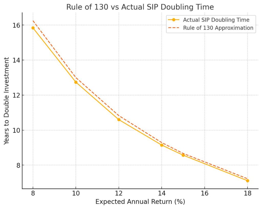 | Expected Return (%) | Actual Years to Double (SIP) | 130 ÷ Return ≈ Rule of 130 |